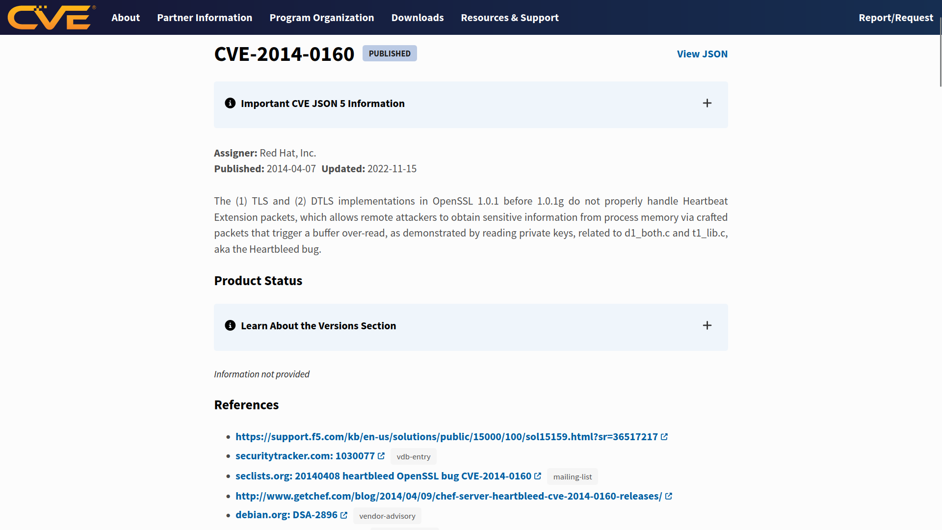 The MITRE Corporation maintains the CVE system. For more information and to search for existing CVEs, visit the CVE Program website. Alternatively, visit the National Vulnerability Database (NVD) website. The screenshot below shows CVE-2014-0160, also known as Heartbleed.